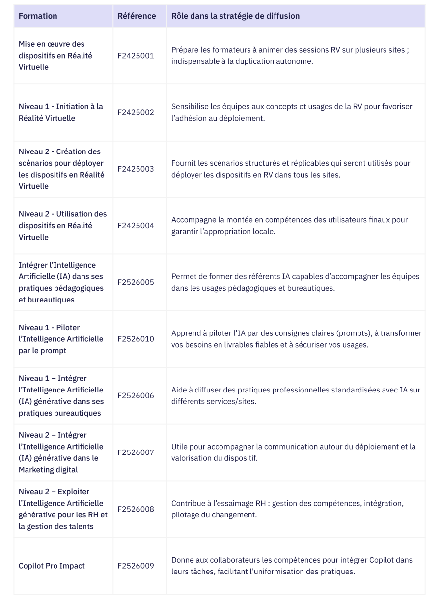 - Préparer les formateurs et collaborateurs à l’usage des dispositifs RV et IA.